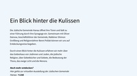 Durch einen Blick hinter die Kulissen erfahren wir mehr über das Gotteshaus von Jüdinnen und Juden, die jüdische Religion, über Gebetbücher und Gebete, die Bedeutung der Thora, das ewige Licht und die Menora.